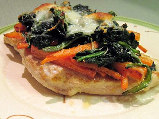 4. Place the carrots on top of the chicken. Place the spinach on top of the carrots. Sprinkle each piece of chicken with the mozzarella cheese.