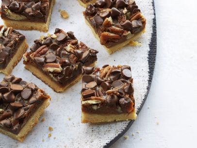 Meanwhile, combine the dulce de leche, heavy cream, egg yolks and the remaining 1 tablespoon flour and 2 teaspoons vanilla in a medium bowl and whisk until smooth. Pour the mixture over the crust and sprinkle with the chocolate chips and pecans. Return to the oven and bake until set around the edge but slightly jiggly in the center, 20 to 25 minutes.