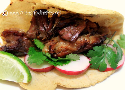 Pork braised with lime, orange juice and aromatics, then pulled, and broiled until tender inside, and crunchy on the outside. A delicious filling for tacos, burritos or tamales.