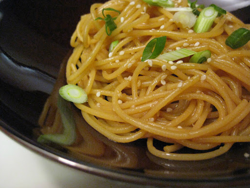 Combine vegetable or peanut oil, soy sauce, sesame oil, garlic and red pepper. Mix well and pour over noodles.
