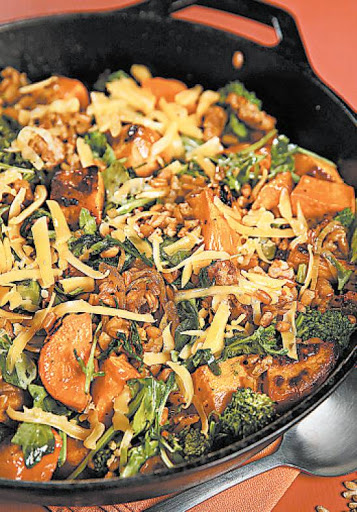 Farro bowl with roasted sweet potatoes, broccoli rabe and sausage
