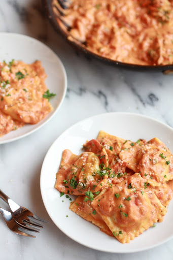Brown butter lobster ravioli with tomato cream sauce