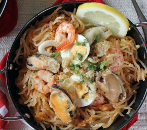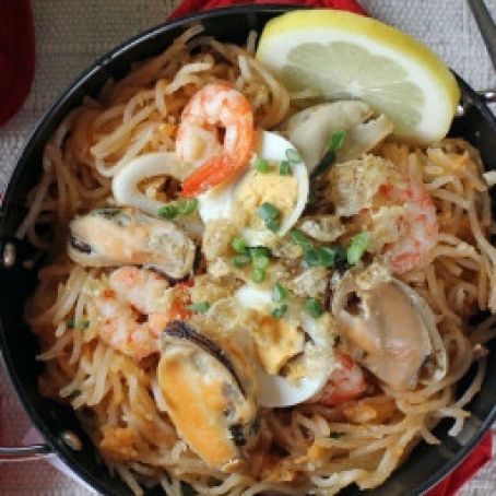Place noodles in a big plate then top with cooked seafood, Pork crackling, Spring onions, eggs and fried garlic.