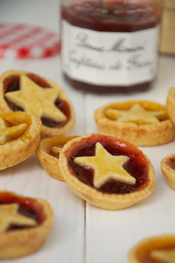 3.Line each hole of the muffin tin with a pastry disc, very gently pushing them down. Prick a few holes in the bottom of the pastry with a fork, so that it does not puff up when baking. Then spoon a tablespoon of your choice of preserve into each one before sitting a pastry star on top.