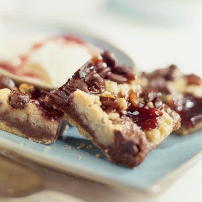 STIR nuts into reserved crumb mixture; sprinkle over chocolate filling. Drop teaspoonfuls of raspberry jam over crumb mixture. Sprinkle with remaining morsels.