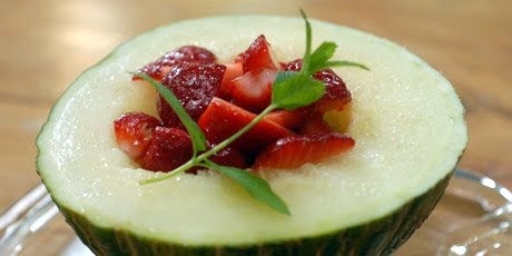 Halve the melon. Remove the seeds. Fill the well with sliced strawberries and raspberries. If you want, add a splash of kirsch or Grand Marnier.