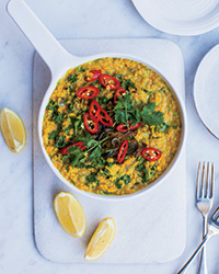 Spoon the dal into bowls. Top with the reserved onion mixture and the remaining sliced chiles. Garnish with chopped