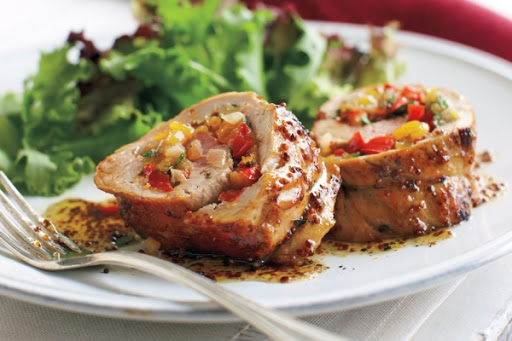 On cutting board, cut pork horizontally in half almost but not all the way through. Open like book and pound with meat pounder to evenly flatten. Mound stuffing lengthwise along centre; fold pork over stuffing and secure with butcher's twine. Sprinkle with remaining salt and pepper.