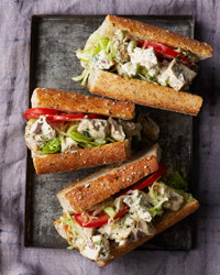 Spoon the chicken onto 6 slices of the toast. Top with the lettuce and tomato, close the sandwiches and serve.