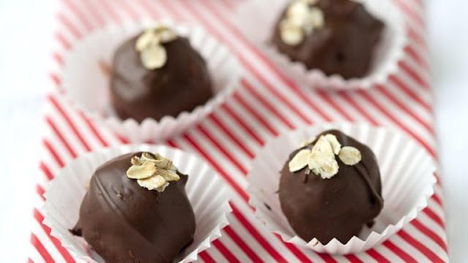 Dip cooled cookie balls, one at a time, into melted chocolate; place onto waxed-paper lined cookie sheet. Immediately place a few oats on top of each coated cookie ball. If necessary, reheat chocolate dipping mixture. Refrigerate truffles about 10 minutes or until coating is set.