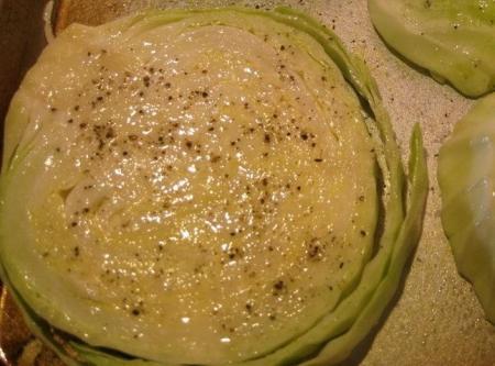 1 Preheat oven to 400°F and spray a baking sheet with non-stick cooking spray. Pull outer leaf off cabbage (it’s usually dirty and nasty looking), cut cabbage from top to bottom (bottom being root) into 1″ thick slices.