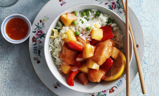 To make the sauce, return the wok to the heat, add 1 teaspoon of vegetable oil, and stir-fry the peppers, onion, and pineapple over high heat for 3 minutes until the vegetables start to soften.