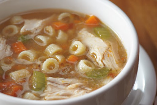 Use a large slotted spoon or a potato masher, mash some potatoes in the pot to lightly thicken the broth. Add the chicken and pasta to the pot. Season salt and pepper. Serve hot.