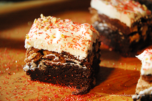 Pour half of the batter into a greased 8 x 8 pan. Lay a layer of Kit Kat bar over the batter, and cover with remaining mix.