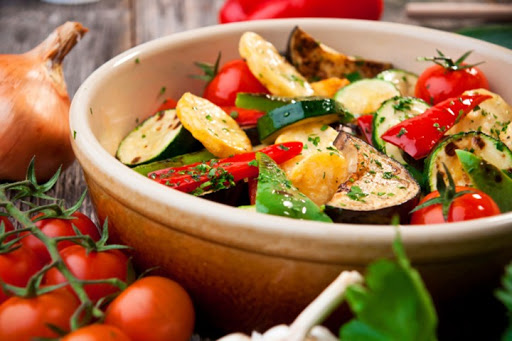 Add the roasted vegetables and place the zucchini “noodles” on top. Cover the skillet tightly and steam for 5 minutes. Serve hot, garnished with pine nuts.