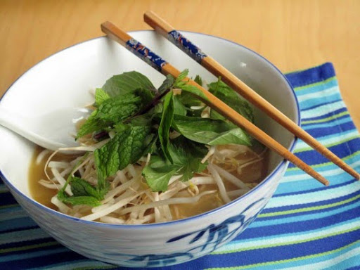 Serves two, but doubles easily. And more preamble here. I used fresh mint, Asian basil, and cilantro for the herbs, all found for cheap at one of the ubiquitous Asian markets in my neighborhood. If you don’t have gems like that where you live, lots of cilantro would do. Use whatever medium-width rice noodles you like. Just make sure to prepare them according to the package instructions. Some require just soaking in hot water, and others need boiling. Even if you have bad luck and they end up all stuck together, they should separate just fine under the influence of boiling broth. And follow Lynne’s instructions to broil your veggies on a piece of foil–it worked beautifully. It will look like a lot of onions, but once they simmer in the broth, they soften and begin to disappear. You need a huge squeeze of lime once you’re at the table–the soup won’t taste like it’s supposed to without it. And one more thing–her recipe calls for very thin slices of beef round or chicken breast, dropped raw into the boiling broth and cooked at the table. We used medium-soft tofu instead.
