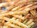 Slice the potatoes into thin matchsticks (1/8-inch thick) with a vegetable slicer or mandoline, dropping them into a bowl of cold water as you cut. Drain the potatoes and dry them thoroughly with paper towels. Drop the potatoes in batches into the hot oil and cook for 3 to 5 minutes, until golden brown. Remove from the pot with a wire basket skimmer or slotted spoon and drain on paper towels. Place on a baking sheet, sprinkle with salt, and keep warm in the oven while you cook the rest of the potatoes.