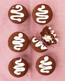 5.Using a small melon baller, scoop out center of each cupcake from the bottom, and reserve (you will use this to plug cupcake after filling). Hollow out each cupcake a bit more, discarding crumbs. Insert tip of plastic bag into each cavity, and squeeze to fill; replace plugs. Using remaining filling in plastic bag, decorate top of cupcakes.