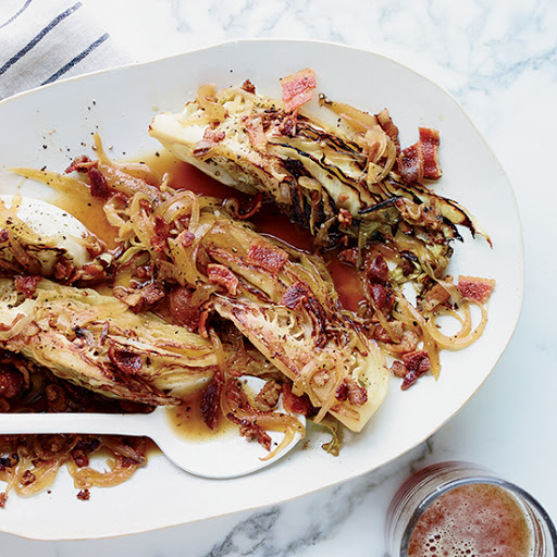 Add the bacon to the skillet and cook over moderate heat, stirring occasionally, until rendered but not crisp, about 5 minutes. Add the onion and a generous pinch of salt and cook, stirring occasionally, until softened and just starting to brown, about 10 minutes. Stir in the vinegar and simmer over moderately high heat until reduced by half, about 3 minutes. Add the cider and bring to a boil. Nestle the cabbage wedges in the skillet, cover and braise over moderately low heat, turning once, until tender, about 20 minutes. Using a slotted spoon or spatula, transfer the cabbage to a platter and tent with foil.