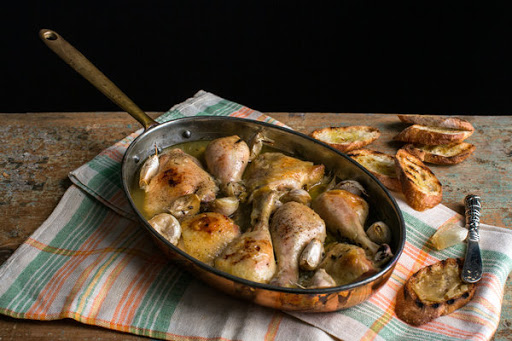 Serve chicken, pan juices and garlic cloves with French bread. Diners should squeeze the buds of garlic from their husks onto the bread, then spread the garlic like butter.