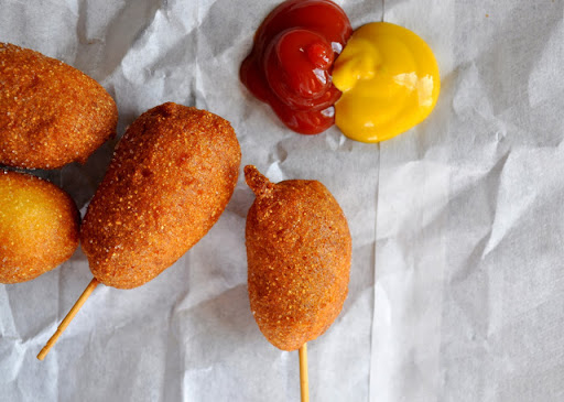 Transfer some of the batter to a tall glass, filling it almost to the top. Working in batches of 2 or 3, dip hot dogs, 1 at a time, into glass of batter to coat (add more batter to glass if necessary), then fry, turning occasionally, until batter is cooked through and golden-brown all over, about 3 minutes. Transfer corn dogs to paper towels to drain. Return oil to 350 degrees F. and refill with batter between batches.