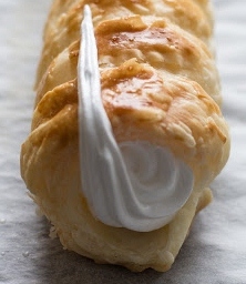 Cut the pastry along the longer side to the strips wide about 2.5 cm. Carefully wind the strips on your metal tubes so that the strips overlap one another. Place them on the baking tray lined with baking paper so that the end of the pastry is down under. Brush with egg wash and bake for 15 minutes, or until golden brown.