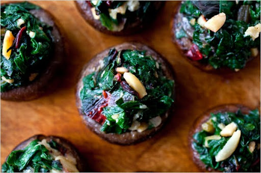 4. Fill the mushroom caps with the chard mixture, packing it in tight. Sprinkle the remaining Parmesan over the top. If any oil remains in the pan, drizzle it over the mushrooms. Place in the oven for 15 to 20 minutes, until the mushrooms are moist and tender.