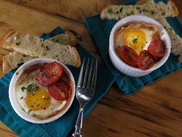Shirred Eggs with Prosciutto, Candied Tomatoes, Parmesan-Rosemary Cream and Ciabatta Sticks 1 Picture
