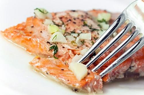 5. Remove lemon slices from the top of the salmon and discard. Gently slide a turner or serving spatula between the skin and the flesh of the fillet to remove the skin, it should separate very easily. Transfer to a serving platter and spoon white wine dill sauce over the top.