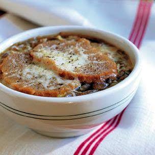 To serve, preheat the broiler. Ladle the soup into individual flameproof soup bowls. Place 2 or 3 slices of bread on top of each bowl and sprinkle with the cheese. Slide under the broiler about 6 inches from the heat element. Broil until the cheese is bubbly and lightly browned, 3 to 4 minutes. Serve immediately. Serves 4 to 6.