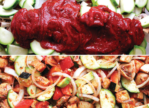 To the roasting pan, add the eggplant, zucchini, peppers, mushrooms, and onions. In a small bowl, combine the tomato paste, vinegar, water, oil, garlic, thyme, salt and pepper and stir until blended and smooth. Add to the roasting pan, then stir and toss to combine and coat the vegetables evenly.