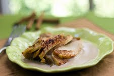 Lay the apples over the top of the bread and pour the caramel over the top. Finally sprinkle the cinnamon and nutmeg over the apples.