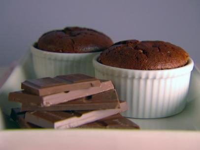 Place a ball of the chilled chocolate mixture in each of the ramekins. Spoon the souffle mixture over the chocolate balls and up to the rim of the ramekins. (At this point the souffle can be covered and kept refrigerated for 2 days.)
