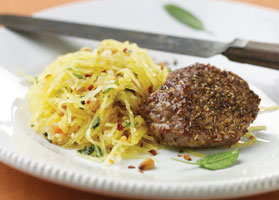 When the squash is cooked, turn over squash to cut side up. With a pasta rake or large spoon, scoop the flesh from the squash shell. The flesh will come out like strands of spaghetti. Add the squash to a large serving bowl and rake through the strands to keep them separated. Add in the pine nut mixture, cheese, sage, crushed red pepper flakes, salt, and pepper. Toss well and serve.