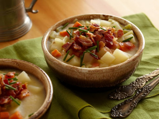 To serve, ladle the soup into bowls. Crumble the reserved bacon on top and garnish with the chives.