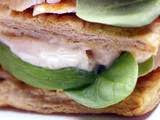 To assemble the Napoleons: Place 4 pieces pastry on a work surface. Slice each chicken breast diagonally into 6 (1/4-inch thick) slices. Place 3 chicken breast slices on each piece of pastry. Place 1/4 cup of spinach and 1 avocado slice on top. Spread 1 teaspoon of the mayonnaise mixture on the underside of another 4 pieces of pastry to create the middle layer of each Napoleon. Place on top. Repeat the layering. Each Napoleon should be completed with a piece of pastry as its top.