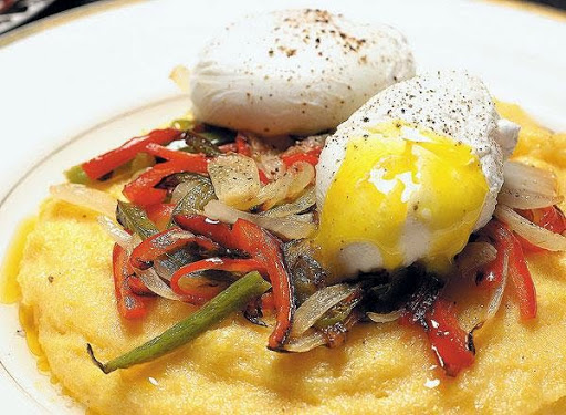 Cortar el jamón en tiritas y cocinar en una cucharada de manteca hasta que esté crocante. Agregar la cebolla cortada en rodajas finas y los morrones en tiritas. A fuego mínimo, revolver hasta que esté bien tierno y jugoso. Condimentar con sal y pimienta a gusto. Mantener caliente. Preparar la polenta. En otra cacerola con agua hirviente y una tacita de vinagre y sal fina, revolver rápidamente con una cuchara. Verter el huevo en el centro, cuidando que el blanco cubra la yema, dejándolo tres minutos. Sacar cuidadosamente con una espumadera y colocarlos en un bol con agua helada para cortar la cocción. Colocar en cada plato una base de polenta caliente, cubrir con abundante salsa y coronar con dos huevos pochés. Condimentar con sal y pimienta molida, a gusto.