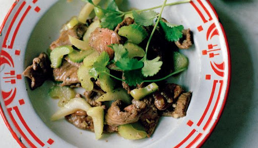 Heat the remaining oil in a wok or deep-sided, heavy-bottomed pan over medium-high heat. Add the remaining 1 teaspoon of garlic and stir vigorously until the oil is fragrant. Stir in the beef and flash-fry for 4 to 5 minutes. Add the sliced celery and continue to stir for a couple more minutes, depending on how you like your beef cooked. The celery should still be very crisp. Serve immediately.