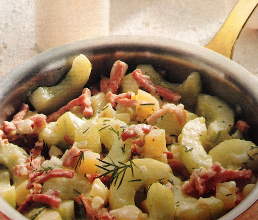 - add ham, fry ham briefly, then add cucumber and potatoes.