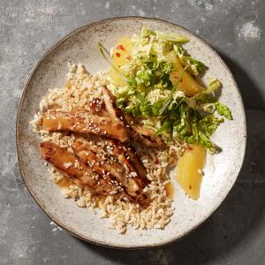 3. Heat a large cast-iron skillet or wok over high heat. Add canola oil; swirl to coat. Add pork in a single layer; cook 4 minutes or until browned, stirring after 2 minutes. Add juice mixture; cook 1 minute or until mixture bubbles and thickens slightly, stirring frequently. Sprinkle with sesame seeds before serving.
