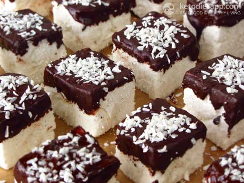 Macronutrient ratio: Calories from carbs (15.1%), protein (26.5%), fat (58.4%) // Net carbs per marshmallow without chocolate & coconut topping: only 0.24 grams