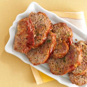 Pat into two greased 9x5-in. loaf pans. Combine ketchup, brown sugar and vinegar in a small bowl. Spread over tops.