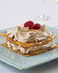 Spoon a dollop of lemon curd onto each phyllo square. Pipe a layer of meringue over the lemon curd (alternately, you can spoon the meringue over the curd). Broil 6 inches from the heat for 1 minute, or until lightly toasted. Set 6 phyllo squares on plates and top them with the remaining 6 squares. Garnish with raspberries and serve.