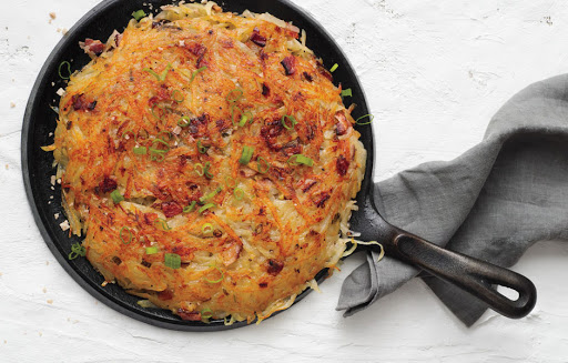 Heat reserved skillet over medium-low heat. Scrape potato mixture into hot skillet, pressing with a spatula into an even layer. Tent with foil; cook for 10 minutes, rotating skillet frequently to avoid hot spots. Remove foil; cook rösti until bottom is golden brown, about 5 minutes longer. Run a silicone spatula around sides and underneath rösti. Invert a large plate over skillet. Using oven mitts, carefully flip rösti onto plate.