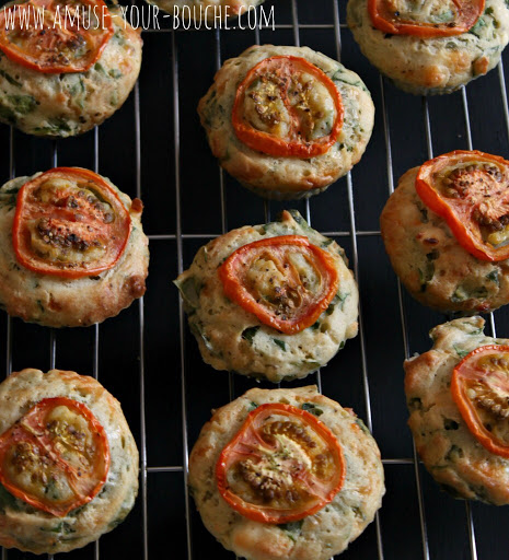 Distribute the mixture evenly between the 12 cupcake cases, and top each with a very thin slice of tomato and a little more salt and pepper.