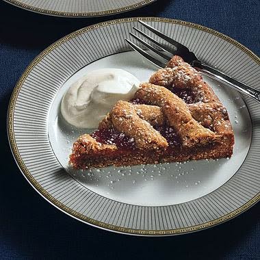 Using some of batter in pastry bag, pipe border around edge of torte bottom. Spread preserves evenly over torte bottom. Pipe remaining batter over preserves in lattice pattern, 5 to 6 strips in each direction. Bake until lattice is firm to touch and preserves are bubbling, about 40 minutes. Cool completely. DO AHEAD: Can be made 3 days ahead. Store airtight at room temperature.
