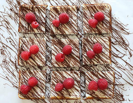 Cut the cake into 9 slices. Melt the chocolate in the mircowave, 30 seconds at a time until melted, careful not to burn. Use a spatula to drizzle the chocolate all over the top of the cheesecake. Top each piece with 2 raspberries and enjoy!