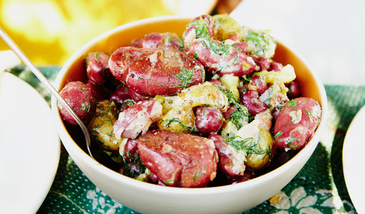 4. Using a potato masher, lightly crush the potatoes (you want them to just break open but not fall apart). Add dill, chives, and half of sausage; toss once. Scatter remaining sausage over top and garnish with dill.