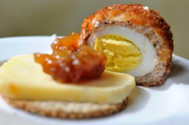 Form each portion into a flat cake large enough to fit around the egg. Work the sausage meat around the egg as evenly as possible whilst working hard to keep the egg shape and making sure there are no cracks. Place the meat coated eggs in the fridge for 15 minutes.