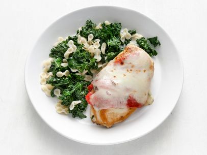Transfer the chicken to the broiler and broil until the cheese melts, about 1 minute. Serve with the kale pasta.